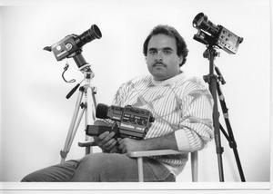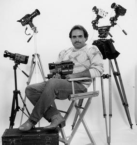 The picture above and to the left was taken by Randy Baldwin about 15 years ago. The Picture to the right features me holding a Beaulieau 7008 (courtesy of Pro 8mm Film, Processing & Super-8 Camera Sales and in a clockwise arrangement a Nikon R-10, and a Canon 1014-XLS. Below left, I'm holding the same Beaulieu 7008. Clockwise is a Canon 1014-XLS, a Nikon R-10, and mounted on the same tripod via an arm extension bracket is a Eumig 881 PMA and a Eumig 860 PMA. Two cameras on one tripod, who knew!